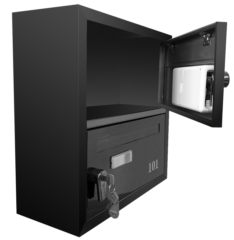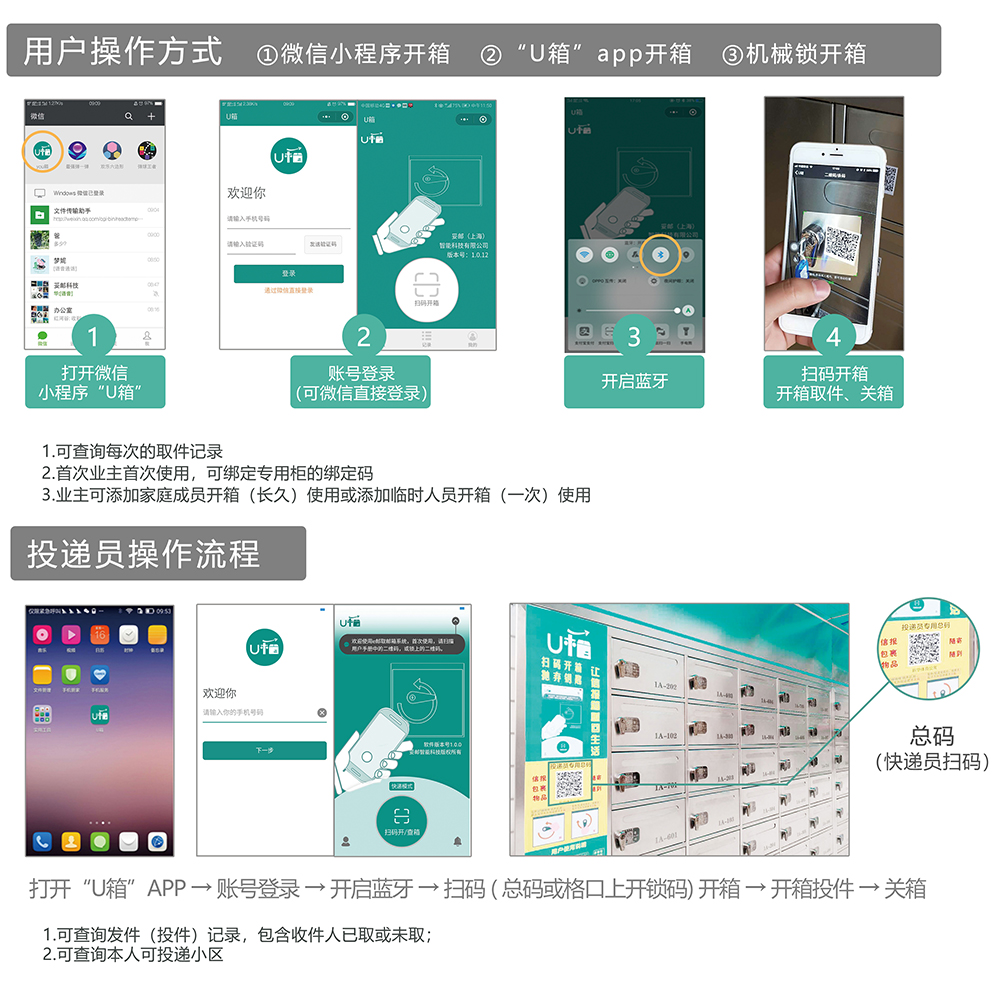 U箱设计一户一箱的形式,每个箱门配置了一个智能把手锁,每个箱门均有一个二维码,业主可以通过微信小程序,或者专用APP,扫码开箱,而快递员在使用APP,经过认证后,或业主授权后,可以扫码将邮件投入业主信报箱,快递员在扫码投件后的第一时间,均会有信息发送至业主手机上,很好的保障了居民的隐私性和开箱安全性。考虑到信报箱常规使用群体为老年人,部分老年人群体仍有使用钥匙的习惯,u箱尤其特色的在每把智能把手锁上预留了机械应急钥匙,通过传统钥匙开箱或者手机扫码开箱的多重方式,大大增加了信报箱使用频率。